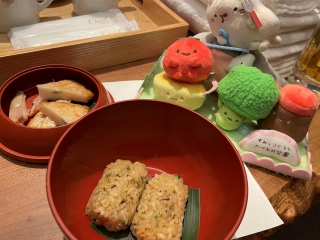 栗ご飯、いかの一夜干し、紅生姜と三つ葉のかまぼこ