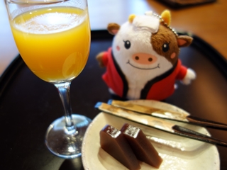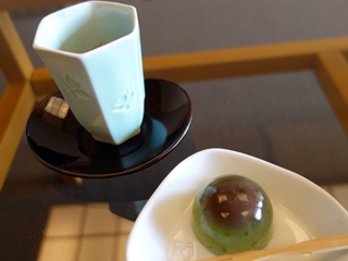 ウェルカムお菓子はヨモギの水饅頭&こぶ茶。