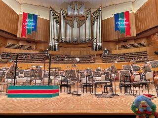 オーケストラは手前の弦楽器しか見えない。